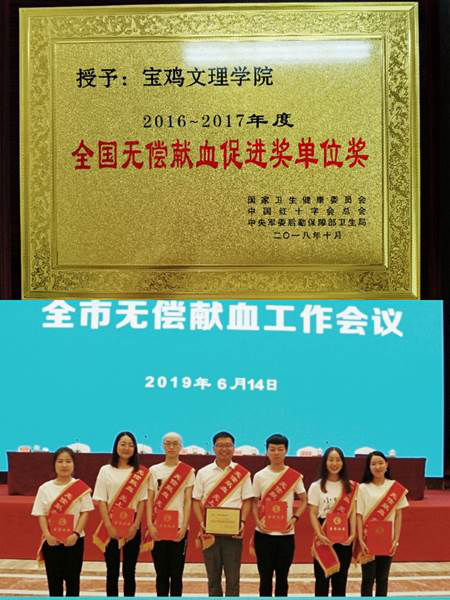 无偿献血是一项崇高的社会公益事业,也是青年大学生践行社会主义核心价值观、履行社会责任的行为体现。近年来,我院先后有14人获得全国无偿献血志愿服务奖,公海贵宾会5500iii多次获得宝鸡市无偿献血先进单位荣誉。