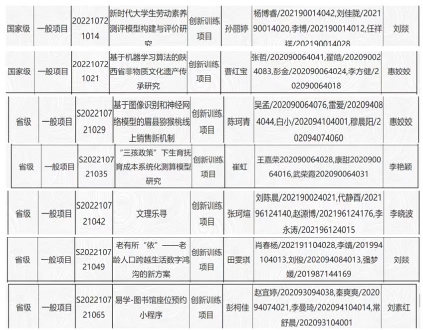 近日,教育部高教司公布了2022年第一批产学合作协同育人项目立项名单;教育部、省教育厅分别公布了2022年国家级、省级大学生创新创业训练计划项目名单。我院共2个产学合作协同育人项目获批立项;共7个大学生创新创业训练计划项目中2个项目获批国家级立项,5个项目获批省级立项; 数学建模获6个奖项中获得本科组国家二等奖1个、本科组陕西赛区一等奖1个、二等奖4个。具体名单如下。