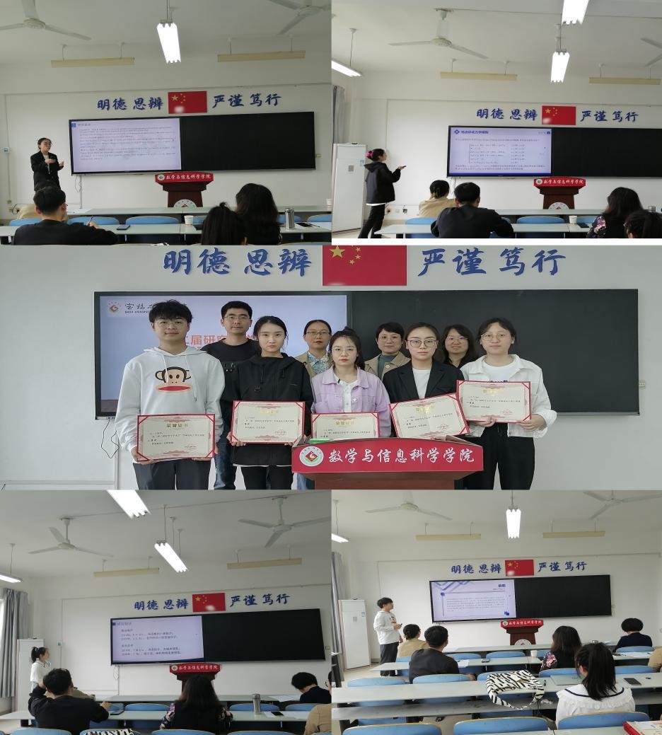 2021级基础数学专业的5名学生参加此次学术报告比赛,报告时学生们精神饱满,语言简明,逻辑清晰,报告内容严谨,重点突出,充分彰显了我院研究生良好的精神风貌和学术素养,报告结束后,各位评委老师从学术素养、语言表述、PPT演示等方面进行了专业的评论,然后评审小组对内容进行量化评审得出最终结果,李颖、刘玉田2名学生荣获学术论坛大赛一等奖,任莹莹、郝露、胡小伟3名学生荣获学术论坛大赛二等奖,最后由刘喜兰、许俊莲、赵继红三位老师为获奖学生颁发荣誉证书。