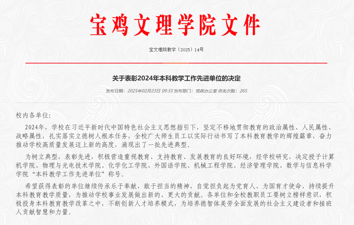 近日,学校公布了《关于表彰2024年本科教学工作先进单位的决定》,学院荣获“本科教学工作先进单位”称号。这是学院自2022年以来连续三年获此殊荣。