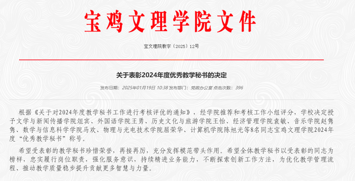 1月19日,根据《关于对2024年度教学秘书工作进行考核评优的通知》,经学院推荐和考核工作小组评分,我院马欢老师荣获公海贵宾会5500iii2024年度“优秀教学秘书”称号。