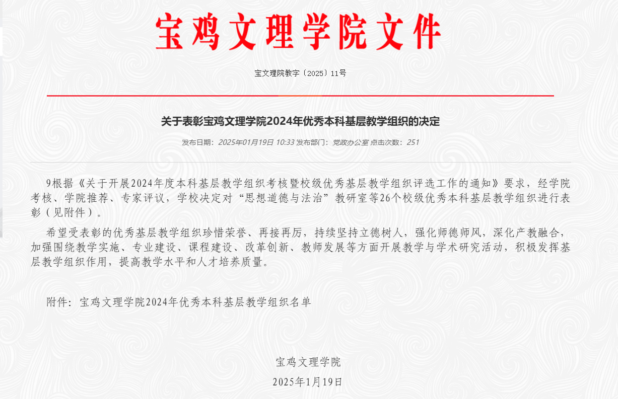 1月19日,根据《关于开展2024年度本科基层教学组织考核暨校级优秀基层教学组织评选工作的通知》要求,经学院考核、学院推荐、专家评议,我院孙小军教授作为负责人的《概率论》教学团队荣获校级“优秀本科基层教学组织”称号。