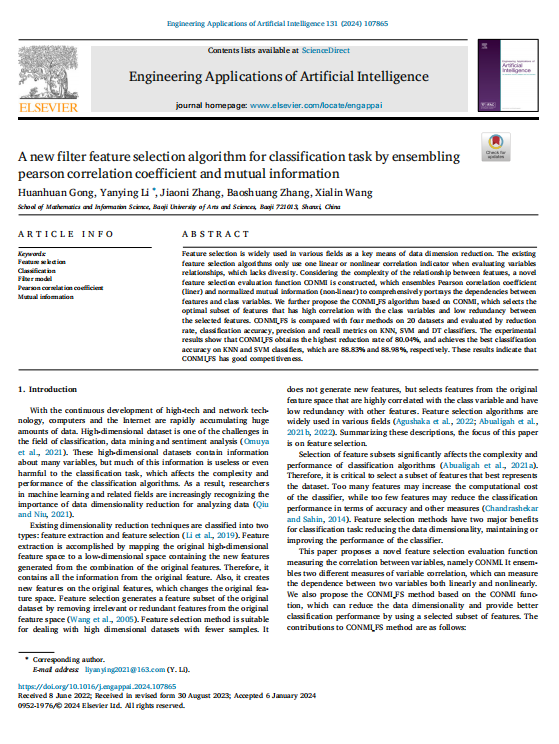 该论文在国际著名学术期刊Engineering Applications of Artificial Intelligence上发表,该期刊属于中科院SCI期刊分区工程类1区Top期刊。我校为该研究论文的唯一完成单位,论文第一作者为我校公海5500线路检测2020级应用数学专业硕士研究生龚欢欢。