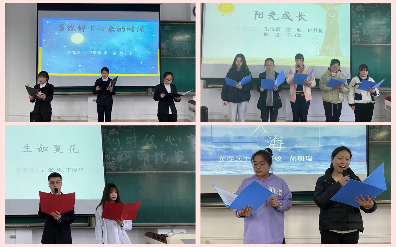 比赛正式开始,参赛选手按照抽签顺序依次上台朗诵,伴随着优美的音乐,选手们声情并茂地朗诵和中场环节的歌曲组成了这一场精彩的演出。选手们用一篇篇诗歌诠释着对生命的理解与热爱;用慷慨激昂的声音表达着对生活的向往、对未来的憧憬;每一处抑扬顿挫都充满着追逐梦想的无限动力。卫傲菊、窦蒙、高丁丁同学带来的《当你静下心来的时候》使宁静的大自然仿佛浮现眼前,世间万物静谧而美好;当马一乐同学朗诵《相信未来》时,那关于美好未来的宏图出现在同学们的脑海;听到梁乐乐、程聪颖同学带来的《致最美逆行者》时,白衣天使抗击疫情的背影在心中清晰而伟岸……比赛中选手们情感激昂、精神抖擞、充满自信,充分展现了当代大学生积极向上的健康心态,他们的表现深深打动了在场每一位观众。