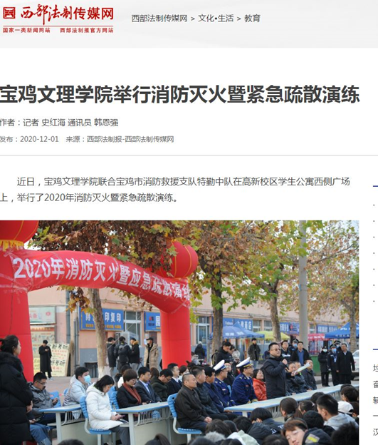 近日,我校党委书记赵健为大学生讲思政课、举办高等教育学会2020年会暨陕西高等教育论坛、举行消防灭火暨紧急疏散演练等活动引起人民日报新媒体、央视新闻移动网、学习强国、今日头条、文化艺术报等多家媒体的广泛关注和报道。