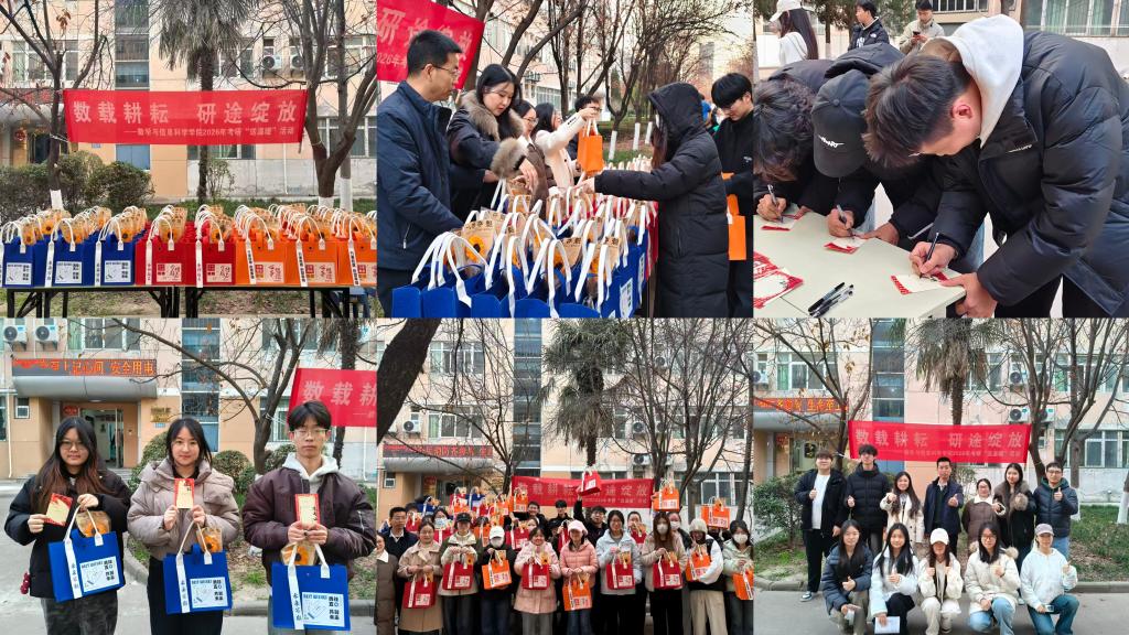 活动现场暖意融融,2026届考研学子有序签到入场。随后,书记与老师们一同为同学们分发精心准备的考研福袋,福袋内不仅备有补充能量的贴心好物,更有助力高效备考的实用物资,以及搭配象征“一举夺魁”的向日葵花,以满满心意陪伴学子们冲刺逐梦。随后同学们在心愿卡上写下对考研的期待与目标。书记与老师们向同学们递上真挚祝福,“愿大家考研顺遂,成功上岸”,句句叮咛饱含深切期许与暖心鼓励。最后,全体师生一同合影留念。