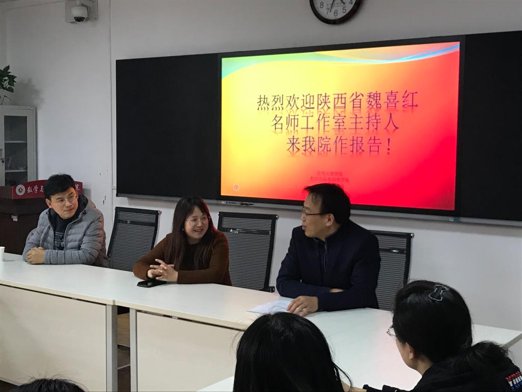 2019年12月18日下午16:30,宝鸡中学魏喜红老师在思贤楼424教室为我院研究生做了一场精彩的学术报告会。本次报告会由公海5500线路检测孙小军教授主持,院长刘淳安教授致辞,2019级教育硕士学科教学(数学)专业全体研究生参加了此次报告会。