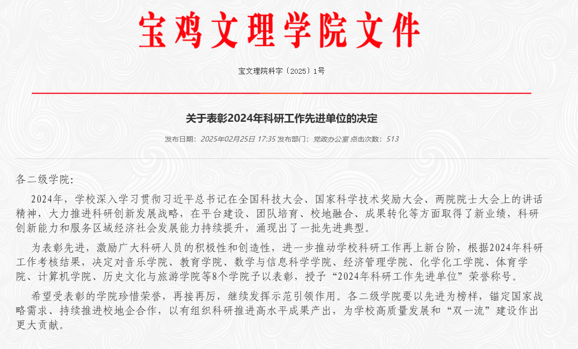 根据宝文理院科字〔2025〕1号文件《关于表彰2024年科研工作先进单位的决定》,学院荣获“2024年科研工作先进单位”荣誉称号。