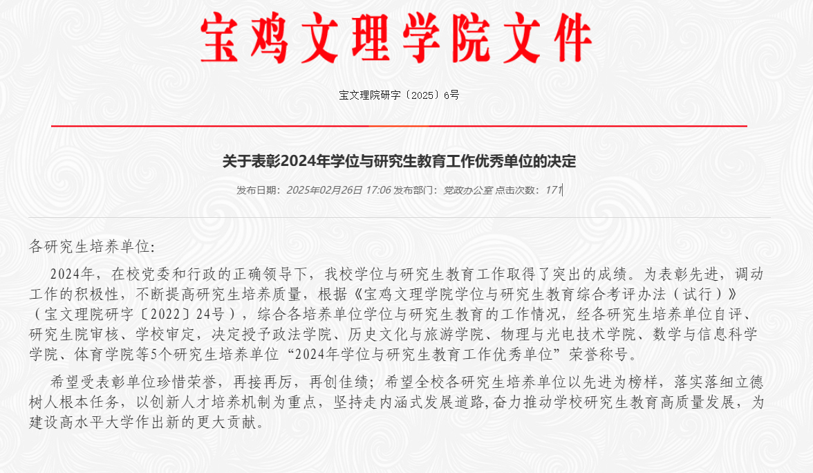 根据宝文理院研字〔2025〕6号文件《关于表彰2024年学位与研究生教育工作优秀单位的决定》,学院荣获“2024年学位与研究生教育工作优秀单位”荣誉称号。