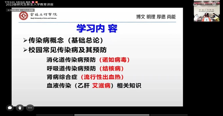 校医院副院长赵菊英以《校园常见传染病防控知识》为题,从新冠肺炎防控、传染病基础知识、校园常见传染病防控等方面向研究生进行系统讲授,并就如何做好个人防护等方面做了防控知识普及。