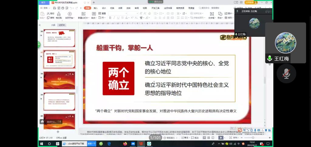 马克思主义学院王红梅博士以《伟大时代的历史跨越》为题,带领2022级新生从新时代新作为新成就、用好“有利条件”走好“必由之路”两个方面,对新时代中国特色社会主义取得的伟大成就进行了全面的解读和讲授,全体新生通过全面认识伟大的中国共产党团结带领人民群众所取得的瞩目成就,激发了对中国共产党的认同感与荣誉感,树立了为新时代建功立业的远大志向,立志做新时代的奋斗者。讲座中同学们与王红梅积极互动、热情留言,纷纷表示在以后的大学生活中将不负韶华、砥砺前行,从新时代新作为新成就中汲取营养与力量,努力成长为堪当民族复兴重任的时代新人。